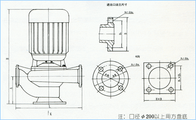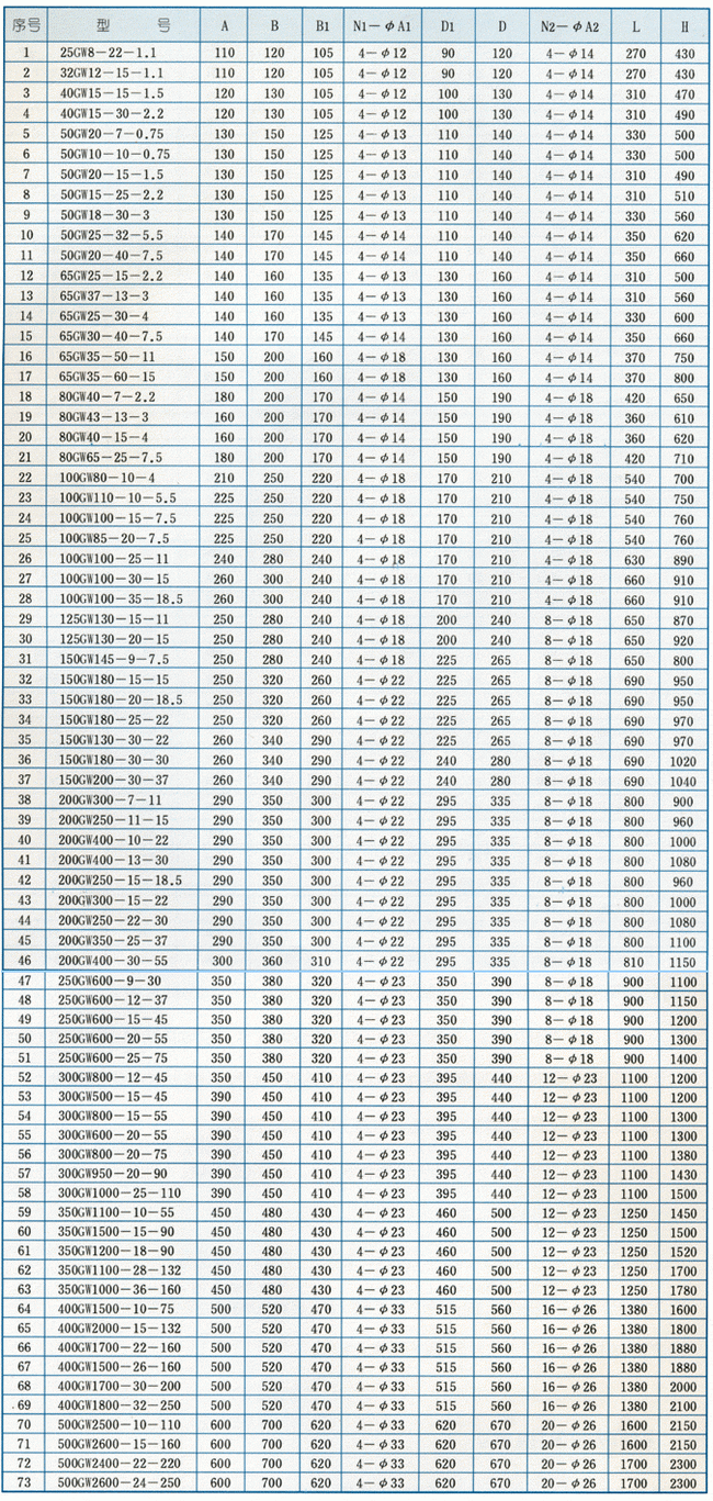 | GW型無堵塞管道排污泵外形安裝尺寸表: |