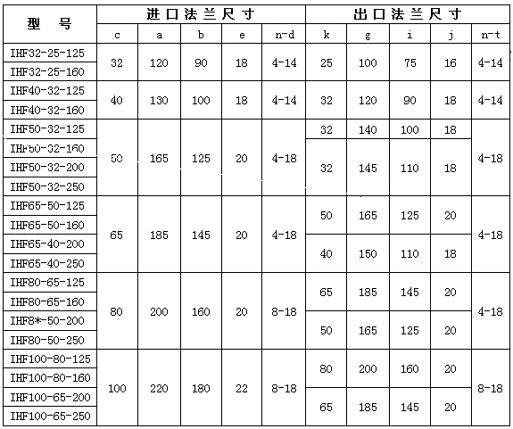 IHF型氟塑料合金離心泵法蘭尺寸表: