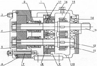 1、雙列球軸承 2、泵用機械密封 3、O形密封圈 4、泵面蓋 5、三葉形泵輪 6、泵體 7、雙頭螺柱 8、軸承壓蓋 9、軸承支座 10、齒輪輪箱 11、圓錐滾子軸承 12、傳動軸 13、主傳動軸 14、齒輪箱后蓋 15、斜齒輪輪(一對) 16、油封 17、O形密封圈