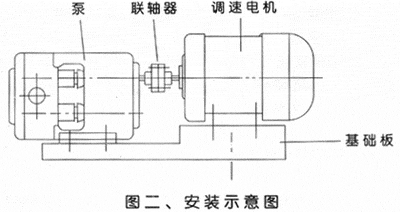 由于該泵不附帶電機(jī)、調(diào)整裝置和基礎(chǔ)板等其它配件,故在安裝本泵時(shí),希參照下圖(安裝示意圖)及前面的技術(shù)參數(shù)表中的電機(jī)功率和最高限速,選用合適的電機(jī)(最好選用調(diào)速電機(jī))型號(hào)和一副彈性聯(lián)軸器,并按照本泵及所選電機(jī)的中心高、配制一塊不銹鋼的基礎(chǔ)板。