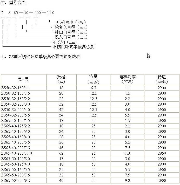 ZS型不銹鋼臥式單級離心泵為泵軸直聯(lián)型聯(lián)結,由泵、泵軸和標準電機組成: