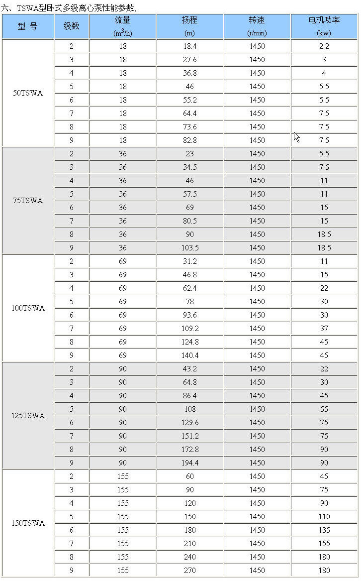 TSWA型臥式多級離心泵系列臥式、單吸多級、分段式結(jié)構(gòu),是新開發(fā)生產(chǎn)的節(jié)能系列產(chǎn)品。具有效率高,運行噪音低,抗汽蝕性能好,結(jié)構(gòu)合理,使用壽命長等顯著優(yōu)點。主要輸送清水或物理化學性質(zhì)類似于水的其他液體。產(chǎn)品執(zhí)行JB/T1051-93《多級離心泵型式與基本參數(shù)》標準。