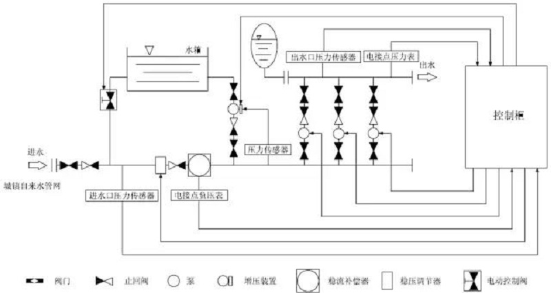SBLW-X全自動(dòng)箱式無負(fù)壓變頻供水設(shè)備實(shí)時(shí)通過壓力傳感器檢測出口壓力,將檢測值和設(shè)定值進(jìn)行比較運(yùn)算,確定電機(jī)及水泵投入臺(tái)數(shù)和變頻器輸出頻率(反應(yīng)為電機(jī)及水泵轉(zhuǎn)速),以實(shí)現(xiàn)恒壓供水的目的。當(dāng)自來水管網(wǎng)壓力波動(dòng)使得壓力值小于正常壓力值,進(jìn)水量暫時(shí)小于出水量時(shí),系統(tǒng)自動(dòng)將穩(wěn)壓裝置關(guān)到適合的位置,并啟動(dòng)增壓裝置通過多點(diǎn)取水,進(jìn)行加壓,知道進(jìn)水口壓力口壓力到達(dá)市政自來水管網(wǎng)正常壓力值,確保設(shè)備進(jìn)水口水量充足,以滿足用戶的用水需求。