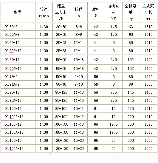 四、NL型污水泥漿泵性能參數(shù):