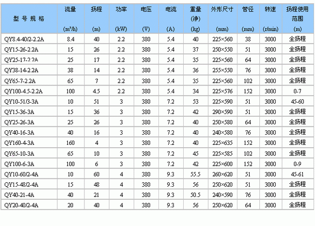 五、QY型充油式潛水電泵性能參數(shù)表