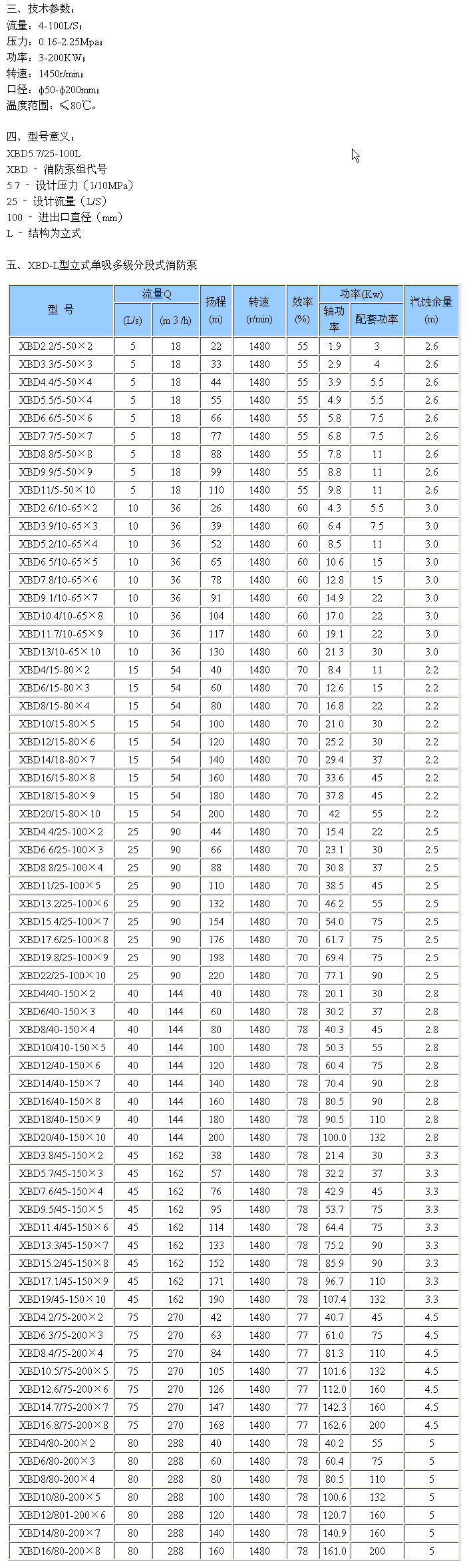XBD-L型立式單吸多級分段式消防泵組,供輸送不含固體顆粒的清水及物理化學(xué)性質(zhì)類似于水的液體之用。主要用于消防系統(tǒng)管道增壓送水,也適用于工業(yè)和城市給排水,高層建筑增壓送水、運(yùn)距離送水、采暖、浴室、鍋爐冷暖水循環(huán)增壓、空調(diào)制冷系統(tǒng)送水及設(shè)備配套等場合。